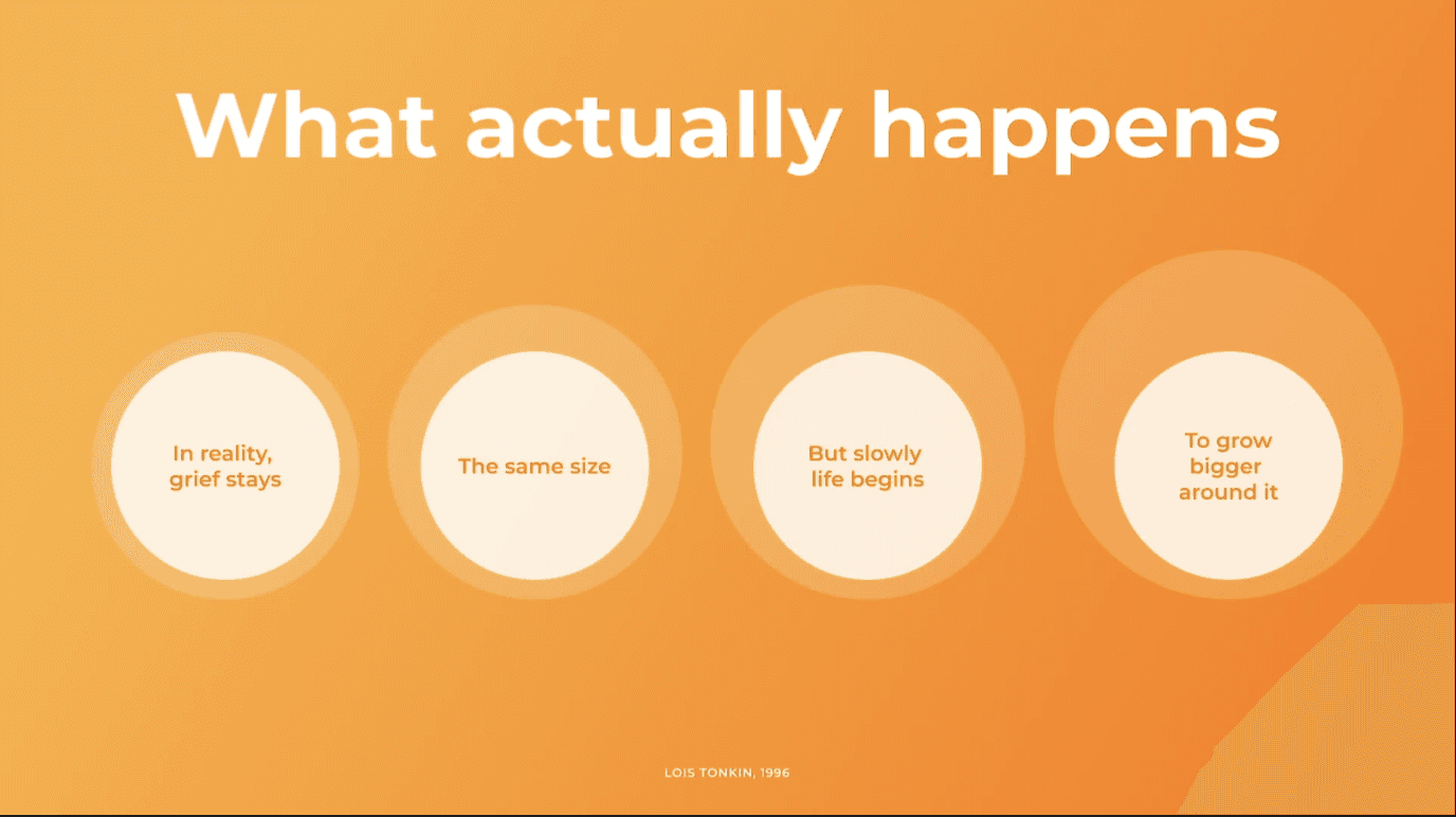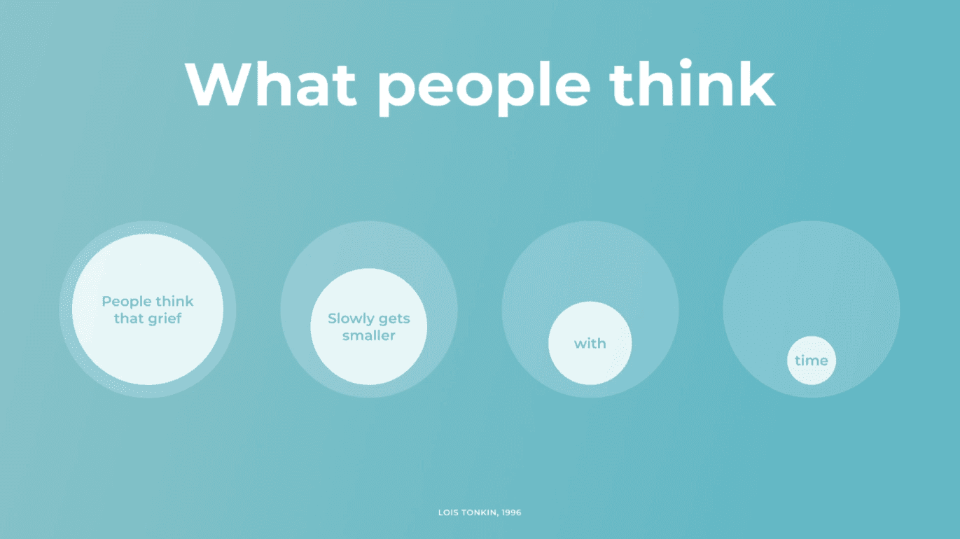 The memories, the death, and the grief never disappear. They'll always be part of your life. What changes is that you rebuild your life around this loss. It's not that your grief shrinks — instead, your life expands.